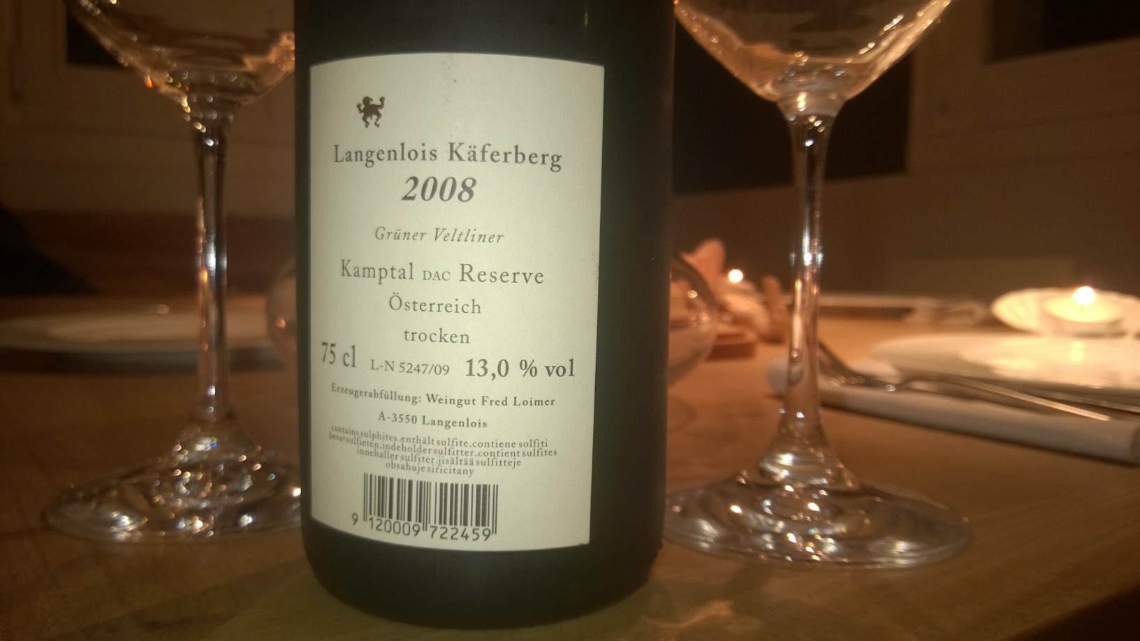 Some nights ago I opened a 2008 (!) Langlois Käferberg, Grüner Veltliner. First thing I want to say: it is perfect to drink now and how good it was storing it so long. What a wonderful, delicious and beautiful wine. 2008 wasn’t an easy year at all according to many reports. Whatever this could mean: Fred Loimer did a great job seven years ago and customers seem to confirm this since the prices of a bottle grow but bearing in mind quality it isn’t too massive; you still can get a Magnum of this vintage for € 77 (!) (http://loimer-shop.at/kaeferberg-gruner-veltliner-weingut-fred-loimer-201.html).